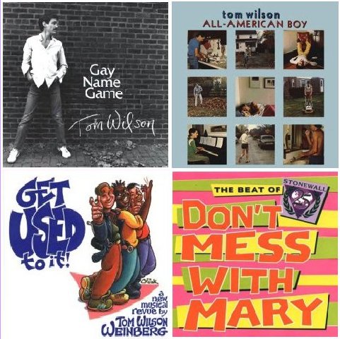 The first photo I took at that UUGC concert, and Tom’s partner (since 1973), John Whyte, even joined in the singing on one number, a favorite spoken-word piece called “1:00 a.m.” Below that are his two solo albums, “Gay Name Game,” and “All-American Boy,” (1982), along with “Don’t Mess With Mary,” which he wrote for the 1994 Stonewall 25th Anniversary, and “Get Used To It,” (1993), one of Tom’s musicals. Another much-performed one he wrote was “Ten-Percent Revue,” and he’s still writing musicals, with one in working stages currently, about Eleanor Roosevelt and Lorena Hickok. Tom and I have stayed friends over the years. In the bottom photo we are at a house concert in NYC, July 2004.