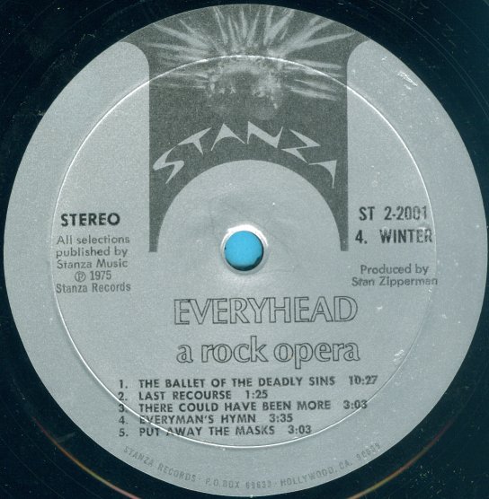 The year 1975 yielded one of the earliest rock operas that touched gay topics, "Everyhead," an ambitious project inspired by the medieval play "Everyman." It tried to cover the ills of mankind (at least American) all over the map, perhaps a bit too symbolically as the cast wore elaborate masks. According to the show's very active website the masks were "worn to hide the identities of the cast so as not to be recognized and to be possibly arrested by the Hollywood vice squad for performing 'obscenities' in public. And the cast recording was immediately banned from radio, which of course is always good for sales. The show was written by Kenneth Cottrell (who sang lead) and David Maverick Lane. Stan Zipperman produced the LP, which included lead guitar work by Michael Monarch, of the band Steppenwolf.