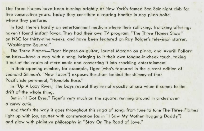 But I've gotten side-tracked, back to the Three Flames. The group was led by Tiger Haynes, who was also known as an actor. He was in the Broadway variety show "New Faces of 1956" and was the original actor to portray the Tin Man in the Broadway version of "The Wiz," in 1975, the role taken over by Nipsey Russell in the 1978 film.